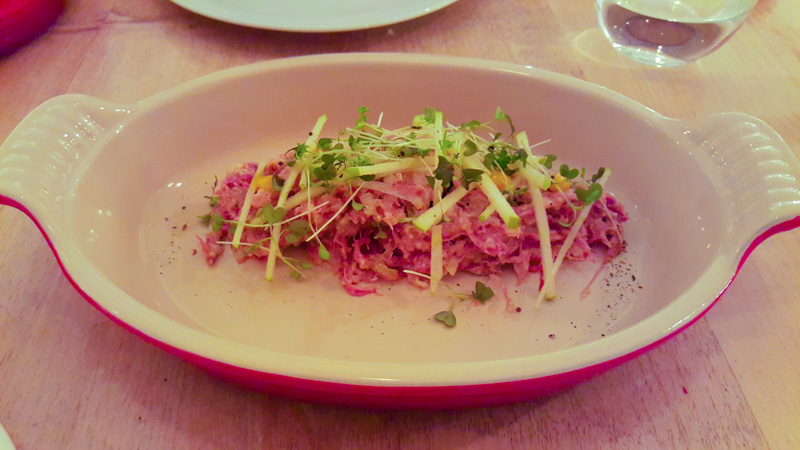 • Ensaladilla de confit de pato, manzana verde y mostaza.