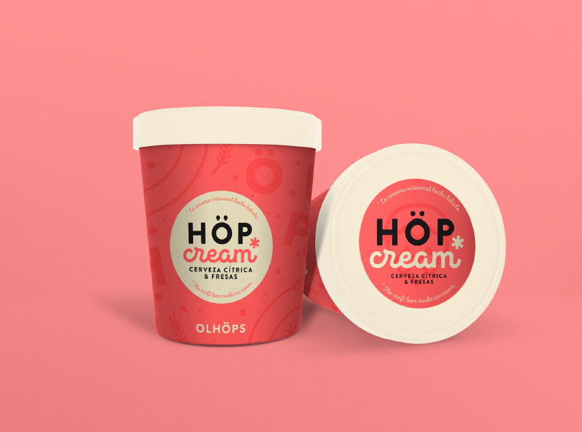 En cuanto a la imagen de marca apostamos por un packaging creativo elaborado por el estudio de diseño Merienda compuesto por Héctor y Jennifer con el objetivo de crear una marca sólida y atractiva donde se representa la cerveza y el helado y que combina a la perfección la imagen del local de Olhóps y con el mural que realizó el estudio Merienda para el mismo.