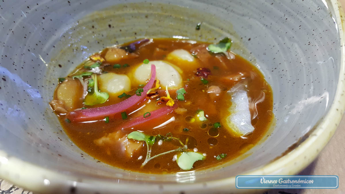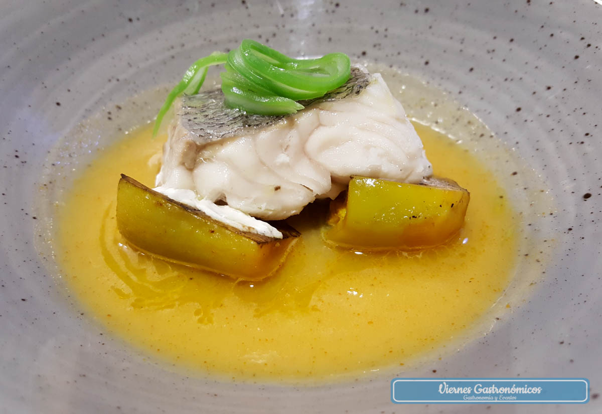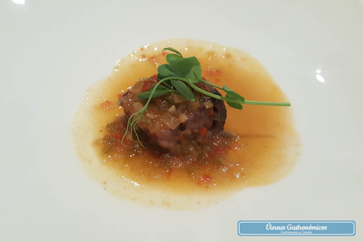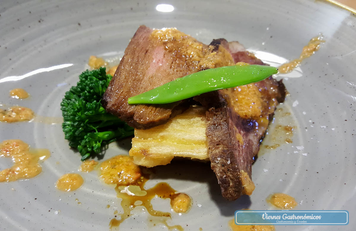 Continuamos con una tempura de ortiguilla regada con un Albariño natural de Pedralonga y un capuccino parmesano, sorprendente este último. Sergi continuó con una innovadora propuesta que combina el foie con la chirivía y el regaliz maridado con José Pariente, elaborado con la variedad Sauvignon Blanc y que también nos sirvió para el siguiente plato: un guisillo picante de carrillera con caldo de miso.