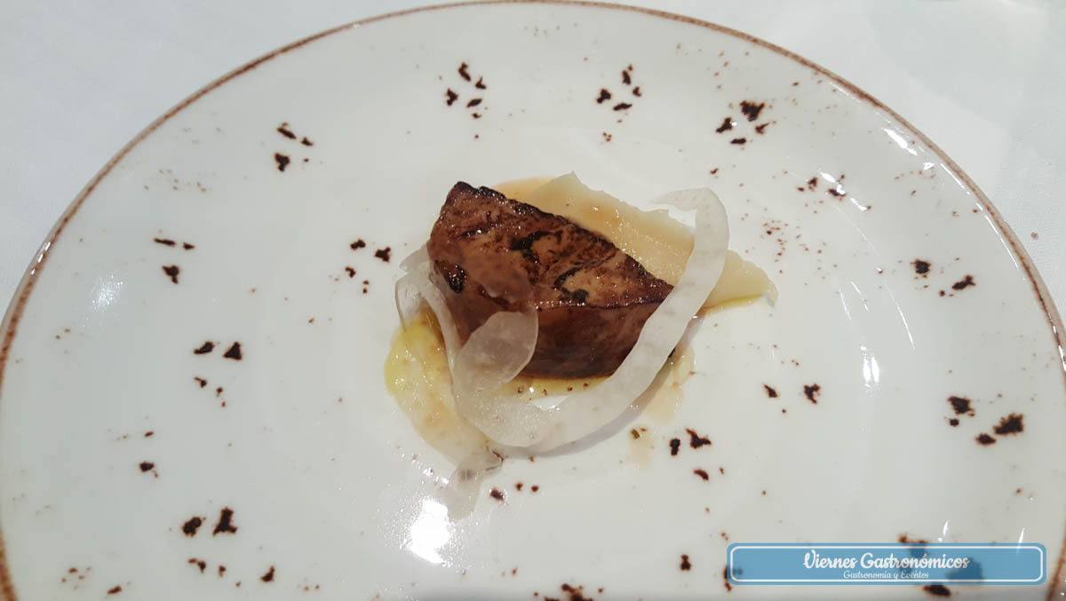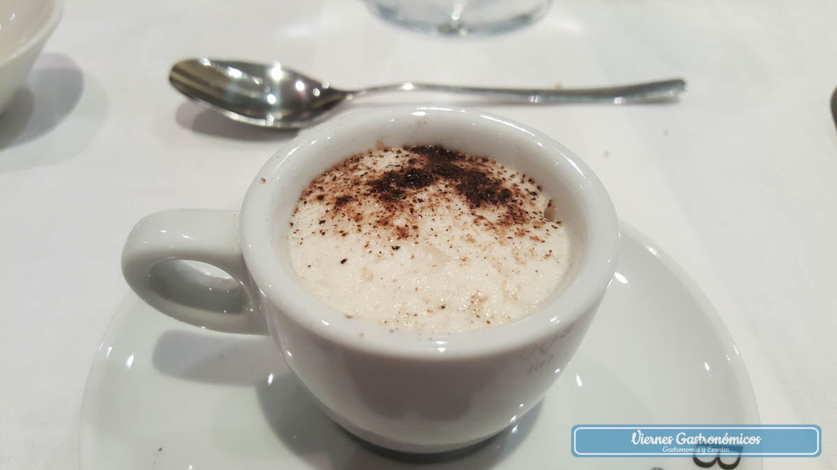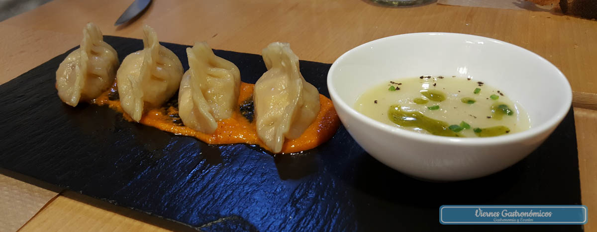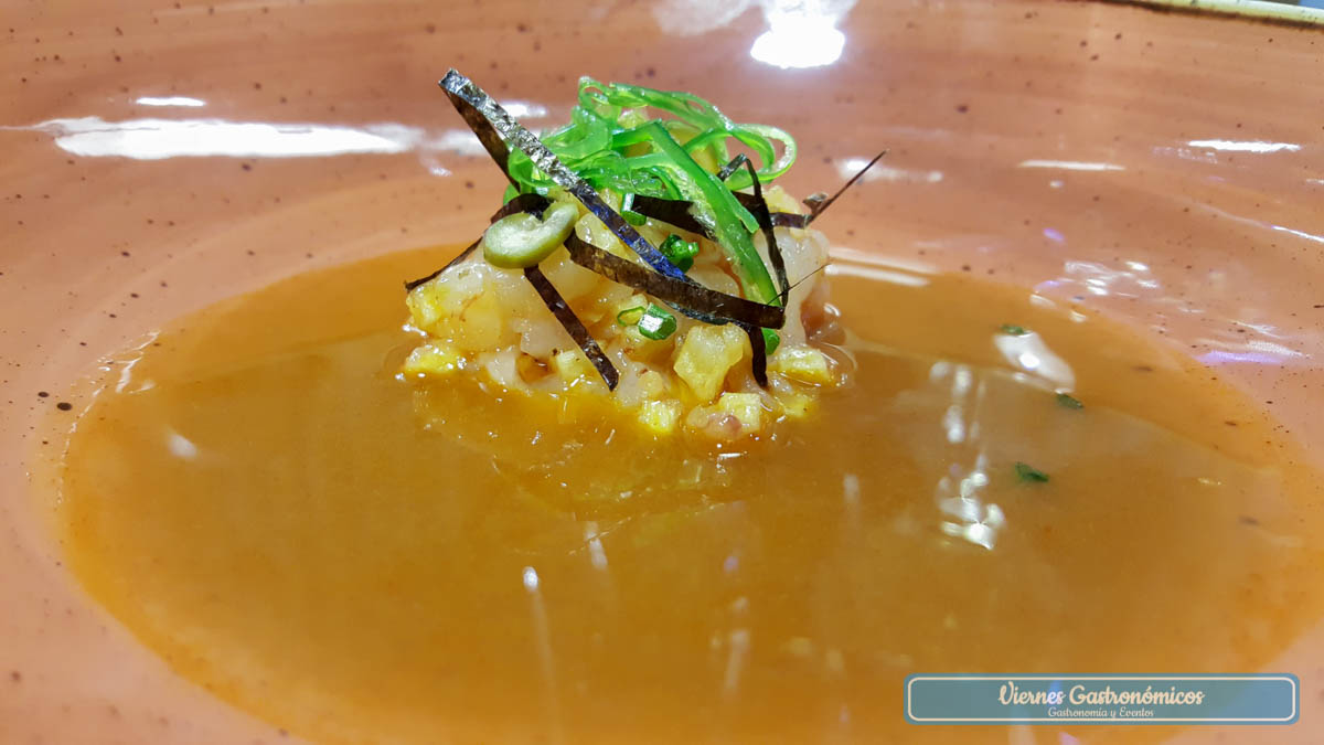 Continuamos con una tempura de ortiguilla regada con un Albariño natural de Pedralonga y un capuccino parmesano, sorprendente este último. Sergi continuó con una innovadora propuesta que combina el foie con la chirivía y el regaliz maridado con José Pariente, elaborado con la variedad Sauvignon Blanc y que también nos sirvió para el siguiente plato: un guisillo picante de carrillera con caldo de miso.