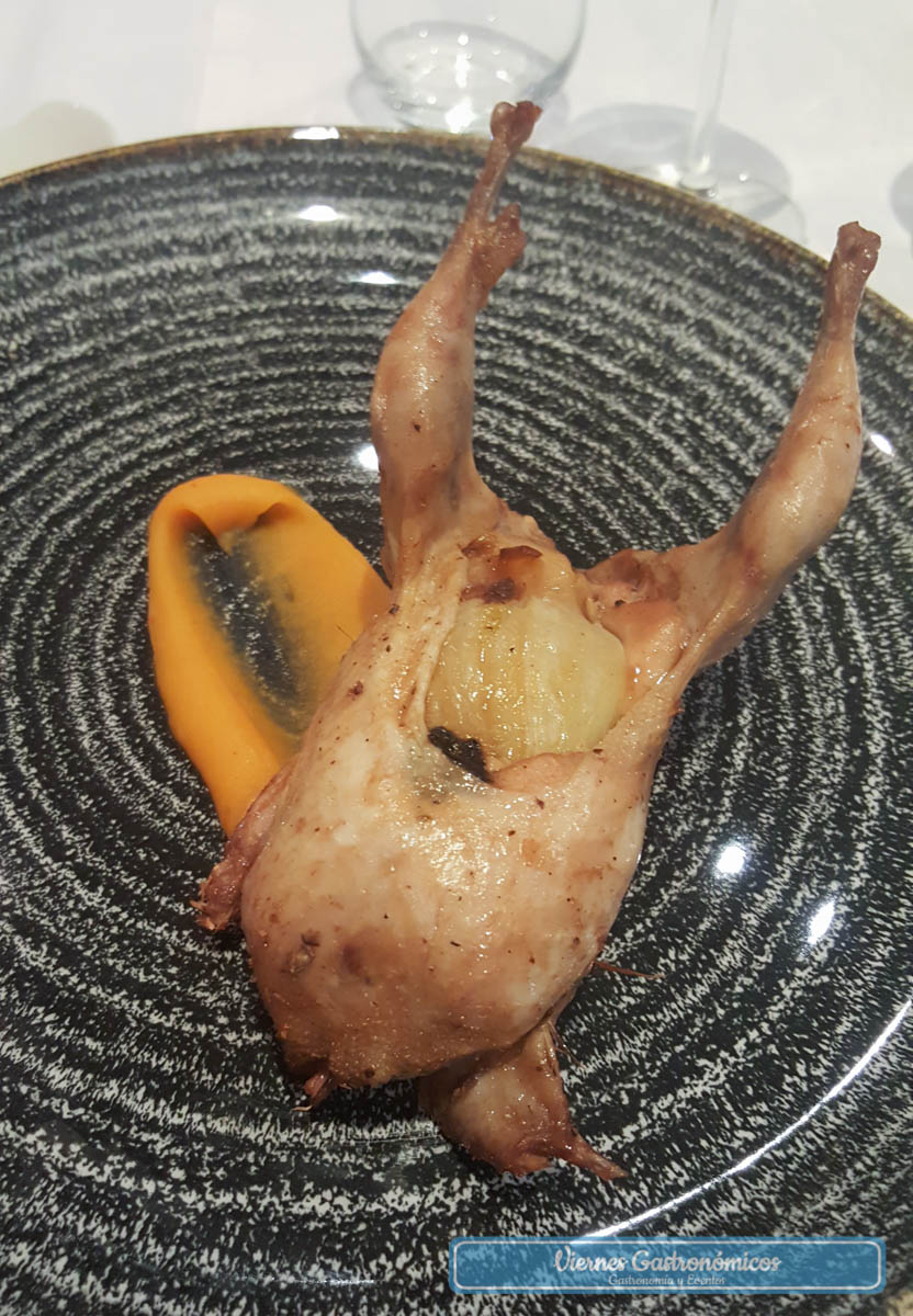 Para terminar su propuesta el cocinero nos ofreció una codorniz packchoy ahumada en un horno Kamado y combinado con L’Angelet 2013 de Bodegas Palmera.